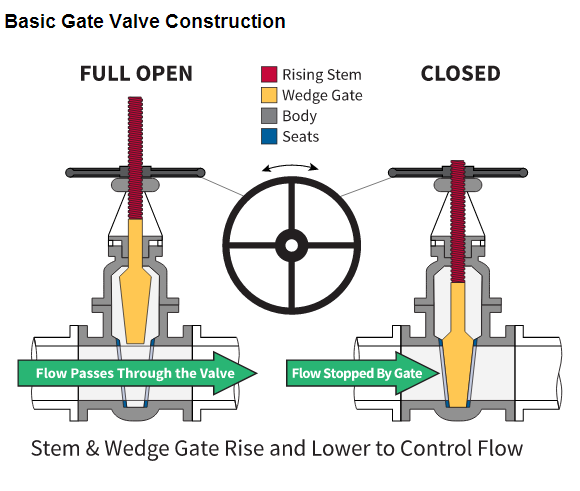 柵極通過移動楔形盤上下障礙物打開和關閉通過閥的流動路徑。這種線性運動通過桿螺紋上升。轉動該螺紋桿需要多次旋轉(多圈)從打開至關閉。轉速所需的閥尺寸通常是在3英寸X+2。因此將需要6英寸的閥20的芯柱(6)3[x+2]=20。它們應當僅用于開/關應用,節流了較長時間,會損壞所述障礙物并密封。使用的閘閥節流還不是非常有效,因為大部分的流量將增長10%。